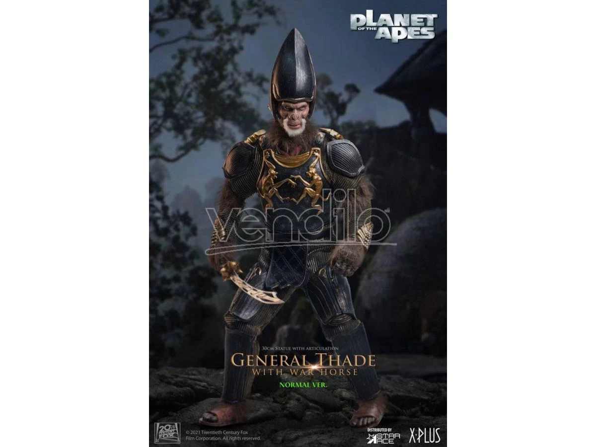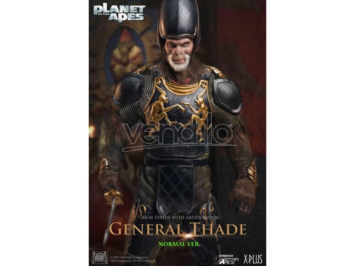 Questa statua in poliresina di Thade ha un costume in tessuto e accenti di pelliccia sotto la sua armatura con un barba in finta pelliccia. È articolato su spalle e collo per una posabilità limitata ed è alto 30 cm. Presenta una dettagliata e autentica somiglianza con Thade nel film ed è meticolosamente dipinto a mano.