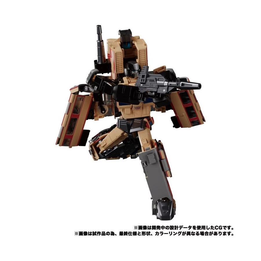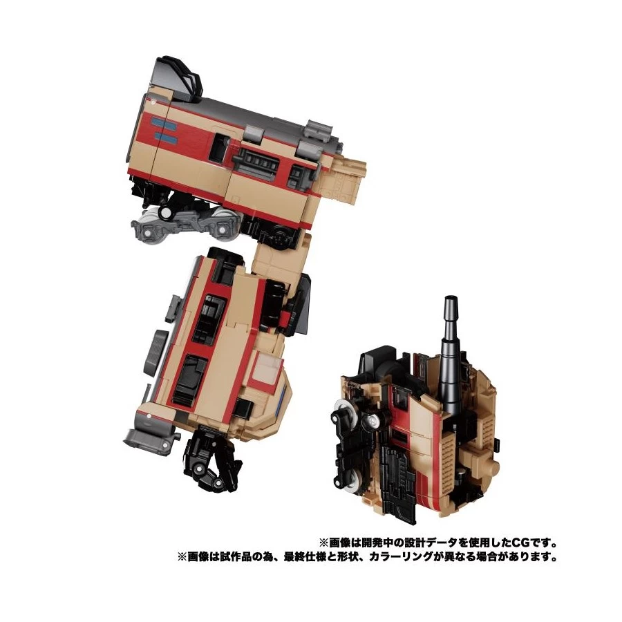 Trainbot Seizan entra nella line-up Takara Tomy Transformers Masterpiece, azione completa, trasformabile, realizzato in ABS, PVC e metallo die-cast. Viene fornito con Brain Laser, rotaie, Luminous Blade per il raiden e 2 Raiden Cannons